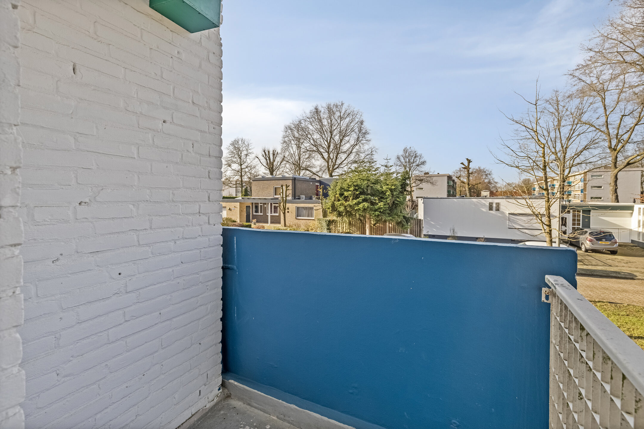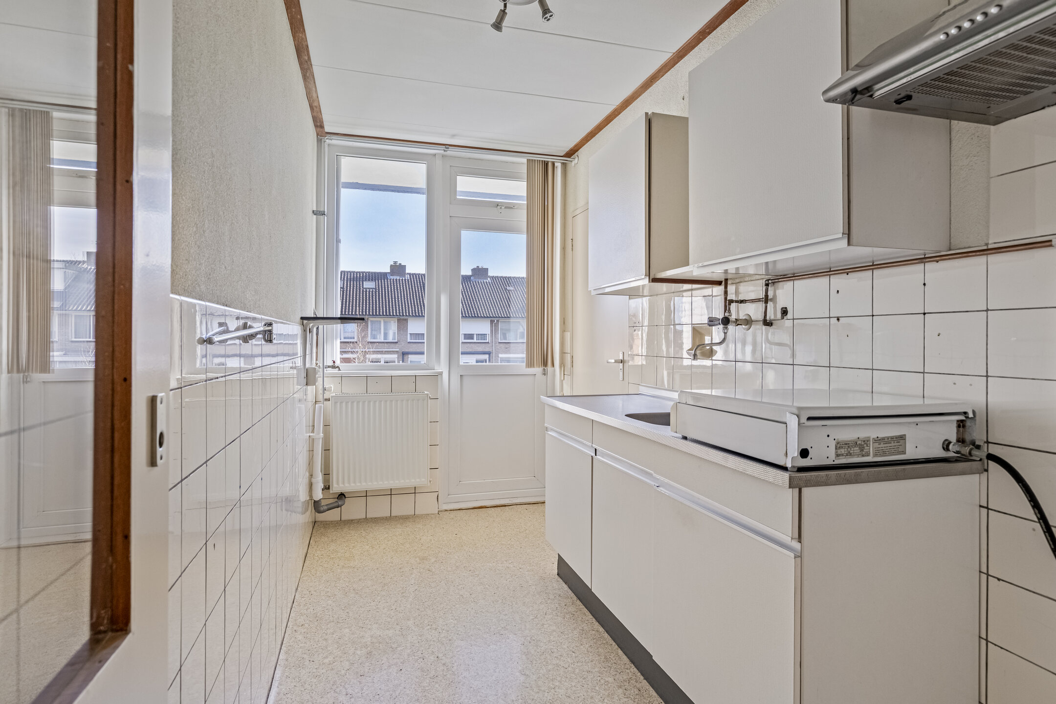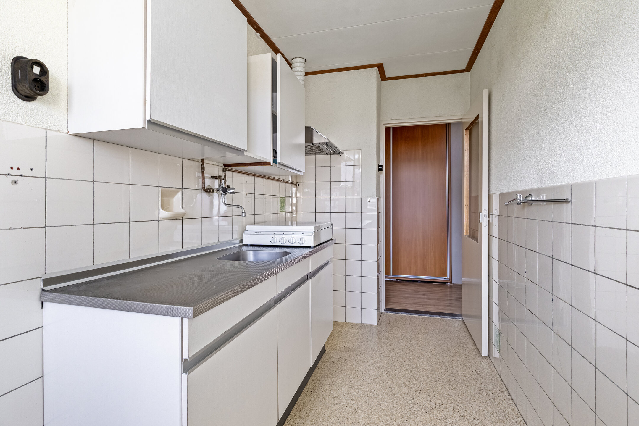 • Keuken (circa 6 m2) met net, eenvoudig keukenblok voorzien van afzuigkap, los 4-pits gaskookplaat en deur naar balkon aan de achterzijde met zicht op groen.