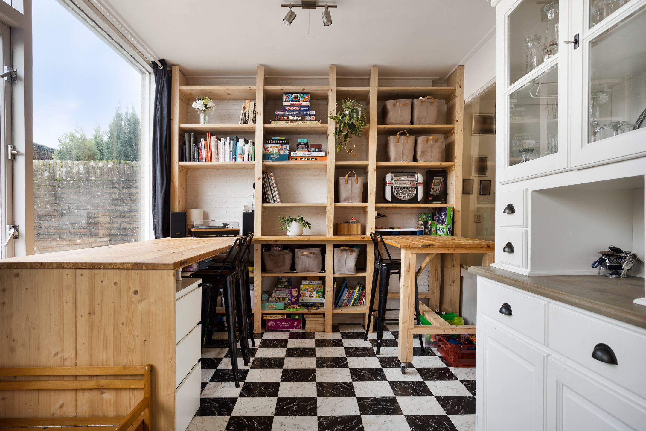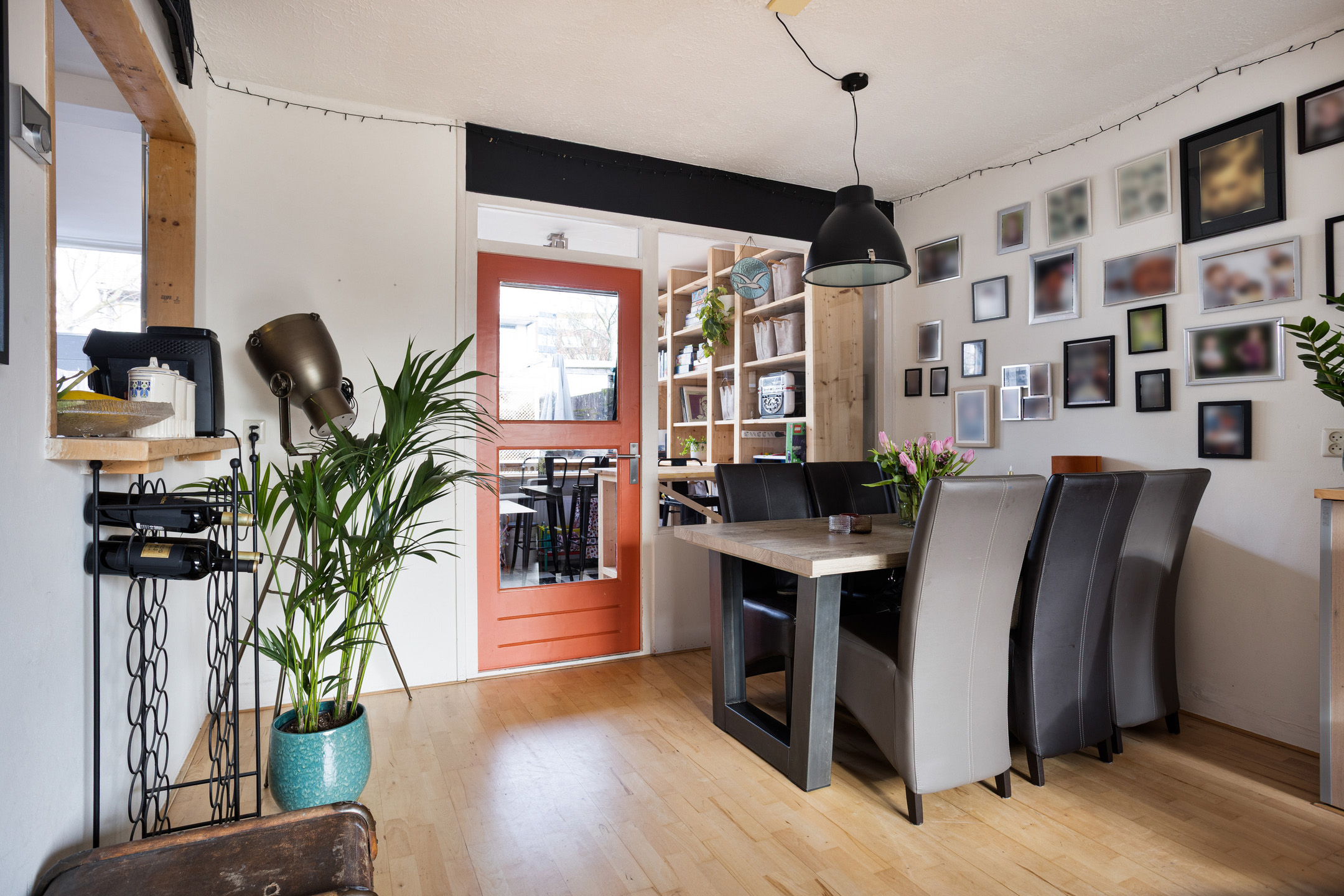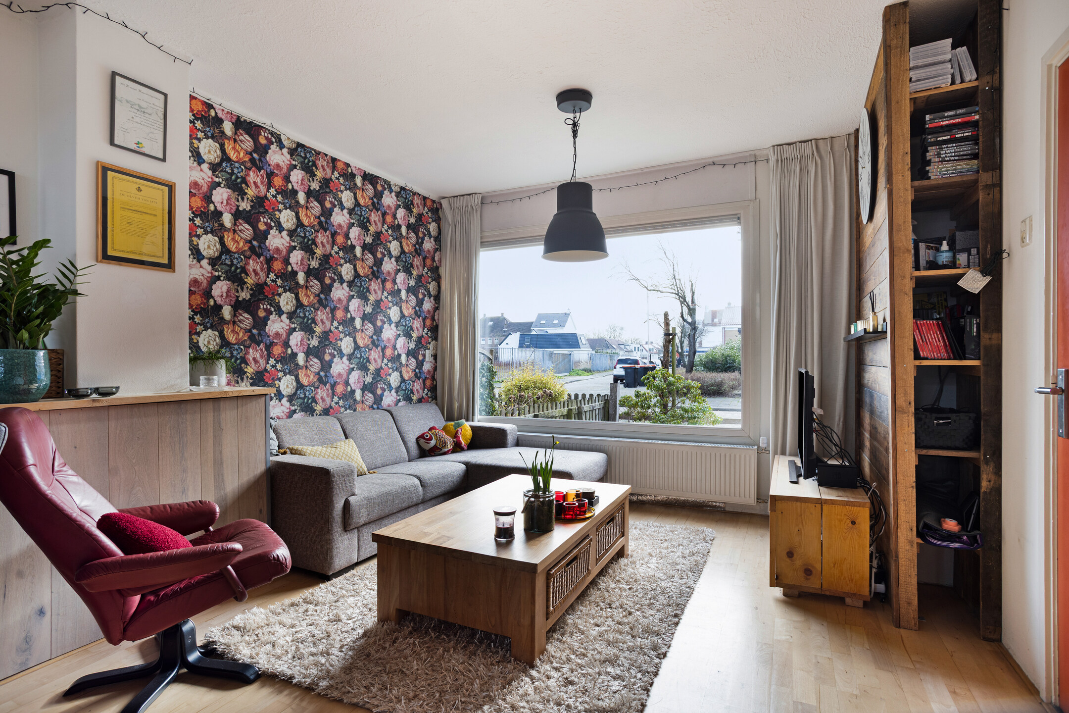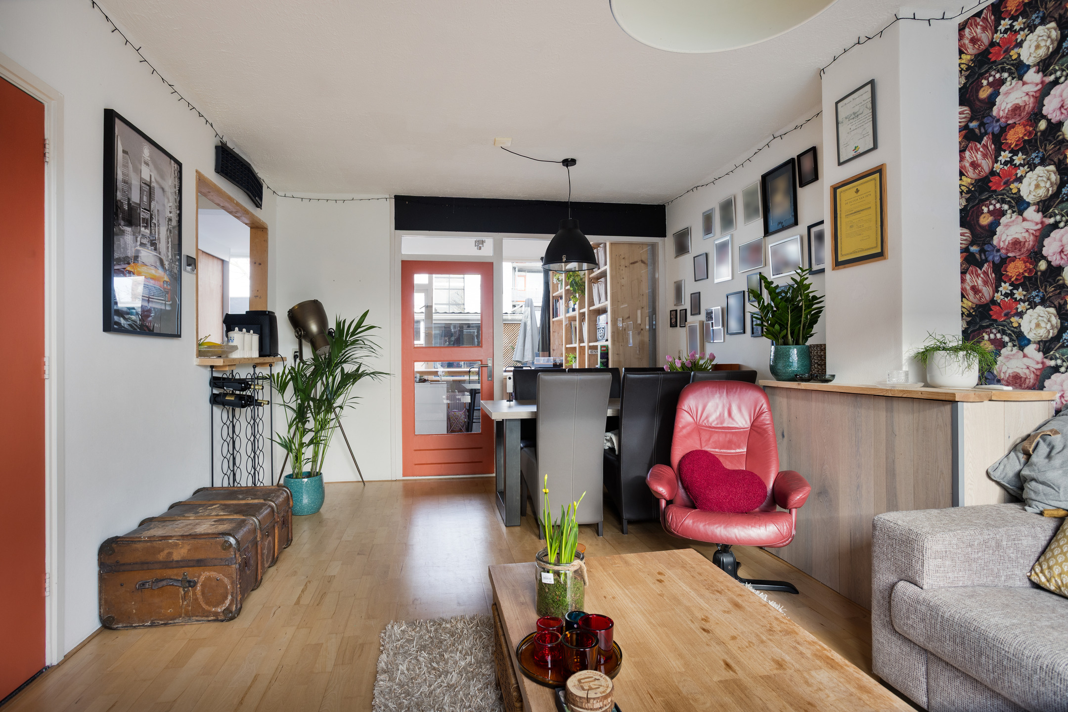 • Royale, uitgebouwde woonkamer (circa 38 m2) met betonvloer voorzien van laminaat en aan de voorzijde voorzien van kunststof kozijn met HR++ dubbele beglazing. Het uitgebouwde deel van de woonkamer is voorzien van (thuis)werkruimte/meubel (eventueel ter overname) en houten kozijnen met dubbele beglazing en enkele beglazing.