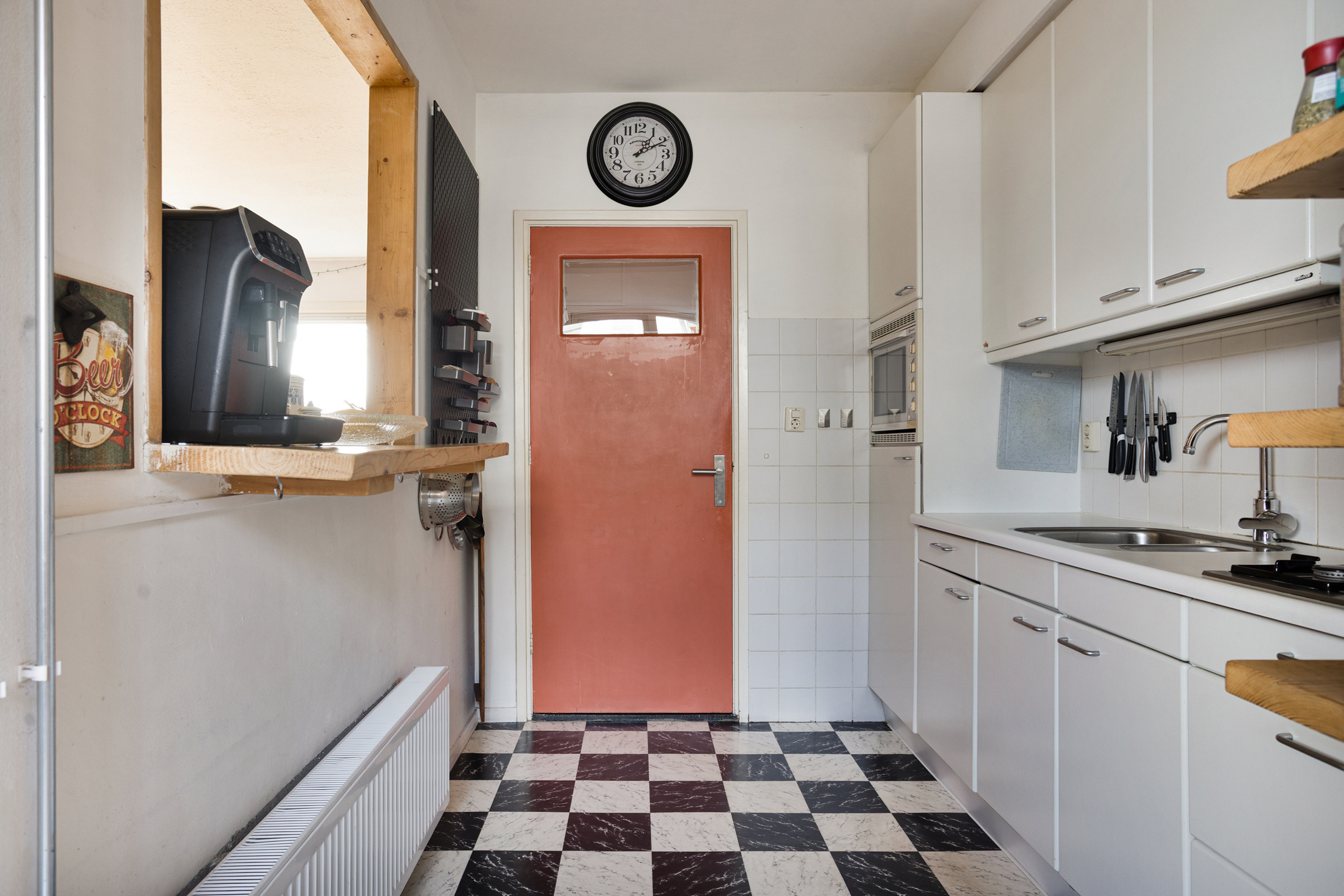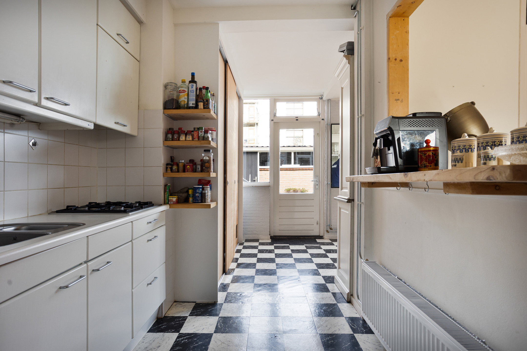 • Semi open keuken (circa 6 m2) met inbouwkeuken voorzien van 4-pits gaskookplaat, afzuigkap, koelkast en oven (magnetronfunctie is defect).