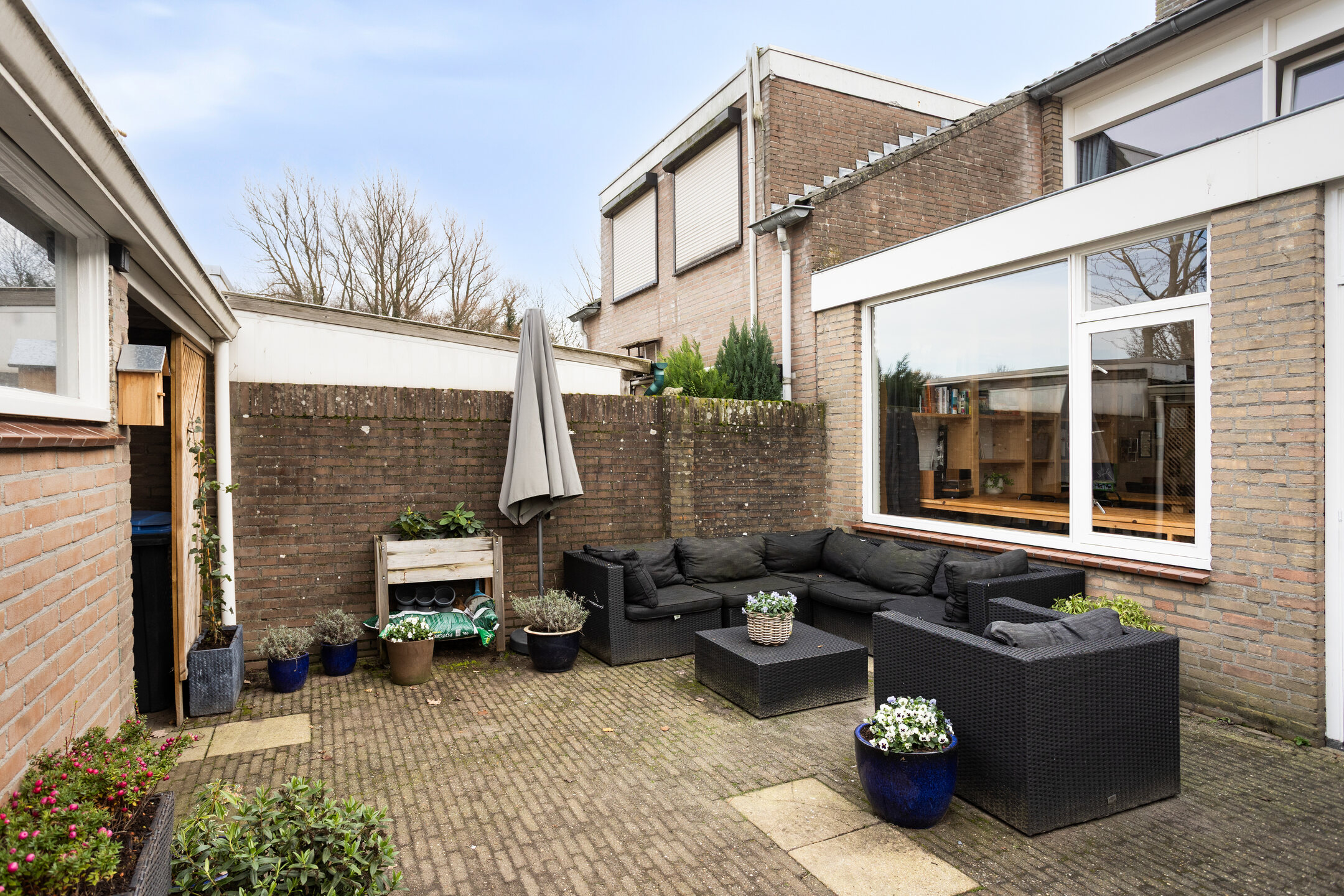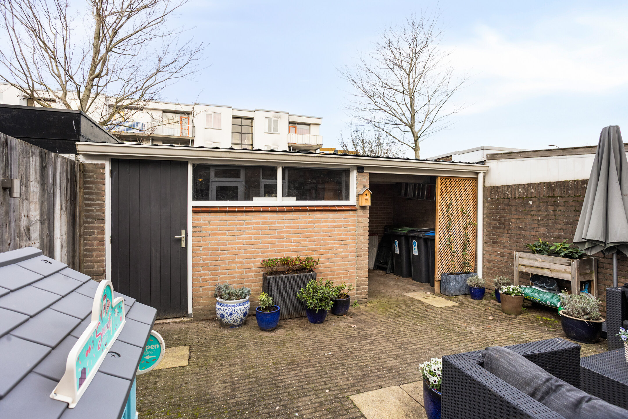 • Achtertuin voorzien van berging (circa 2,6 x 3,7 meter), (fietsen)overkapping en achterom.