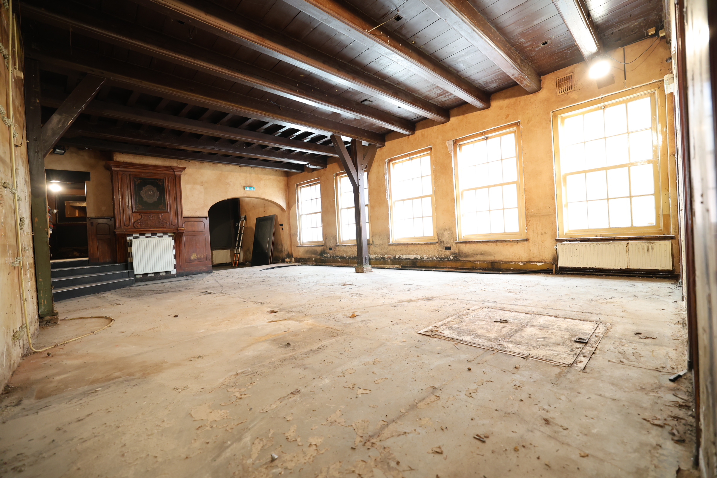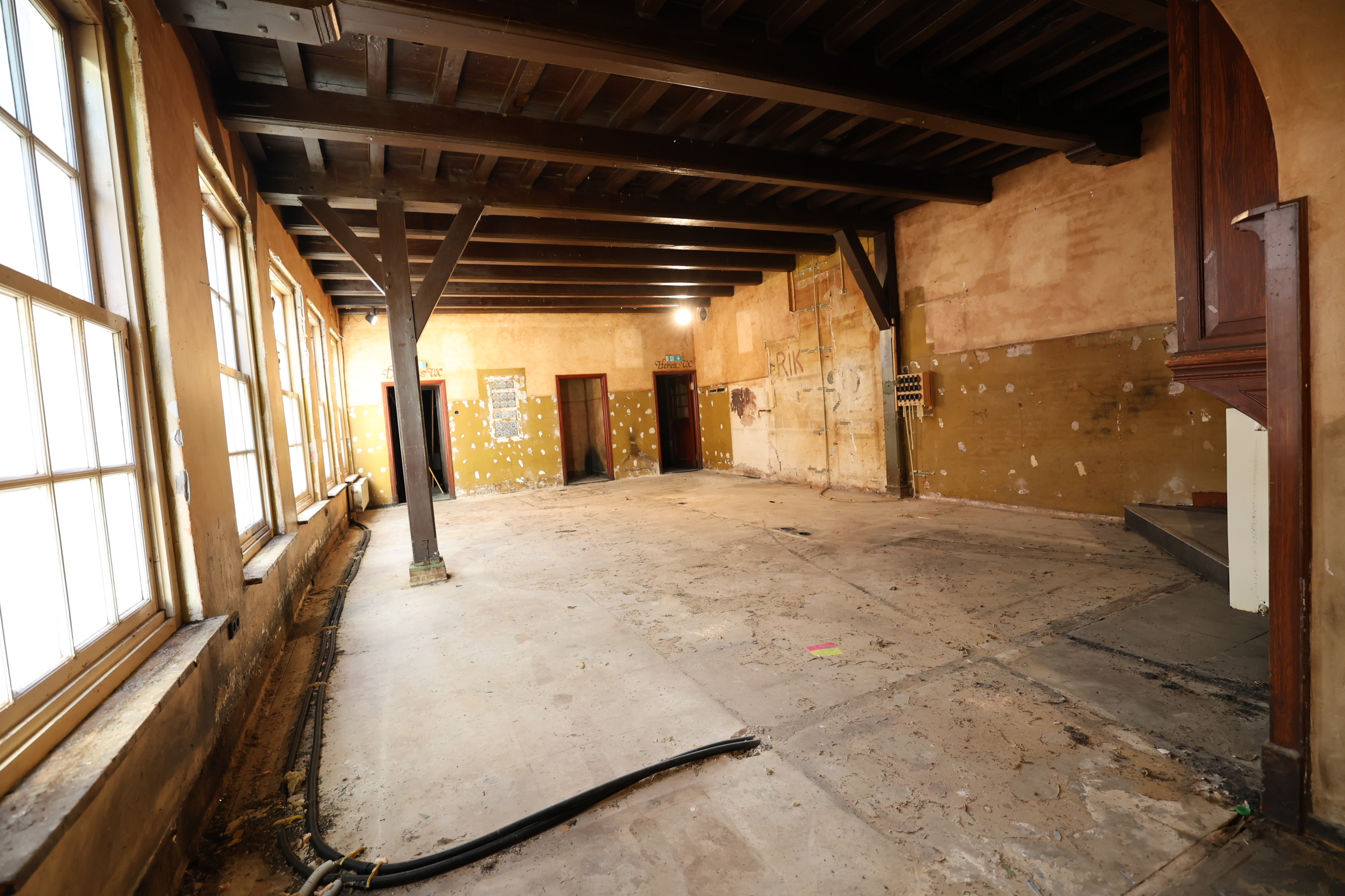 • Grote, voormalige caféruimte (circa 72 m2) met balken in het zicht en grote raampartijen aan de zijkant.