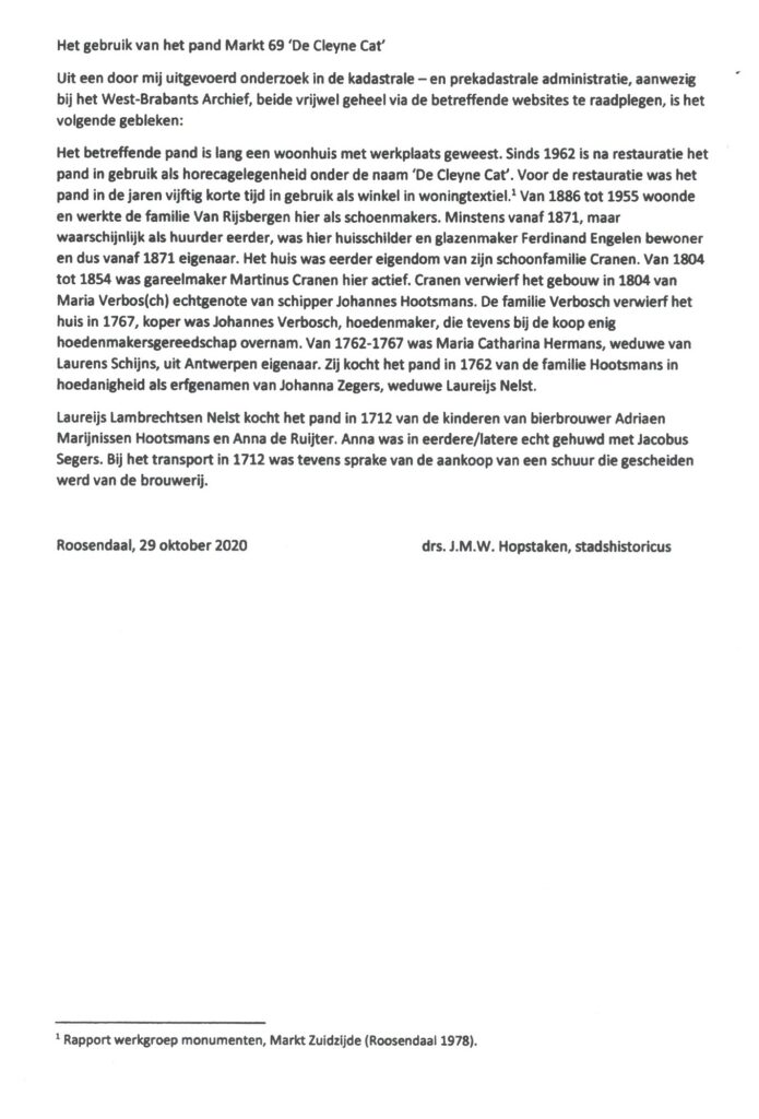 Dit bijzondere pand is gebouwd omstreeks 1665 en lange tijd in gebruik geweest als woonhuis met werkplaats van gareelmaker. Daarna tot 1955 een schoenmaker. Het rijksmonument is omstreeks 1962 gerestaureerd en was tot kortgeleden het “enige” nachtcafé van Roosendaal. Vele Roosendalers hebben vast en zeker bijzondere herinneringen aan de nachtelijke uitjes/uurtjes in “De Cleyne Cat”.