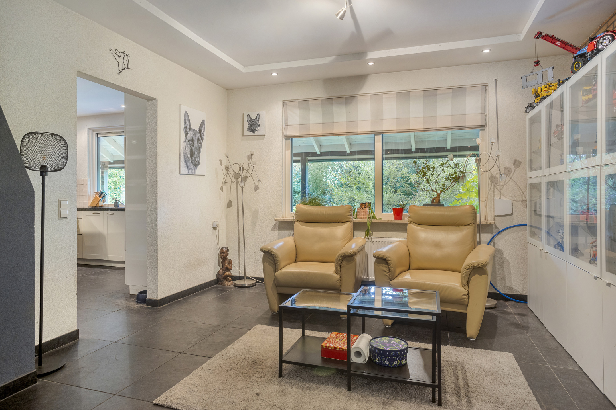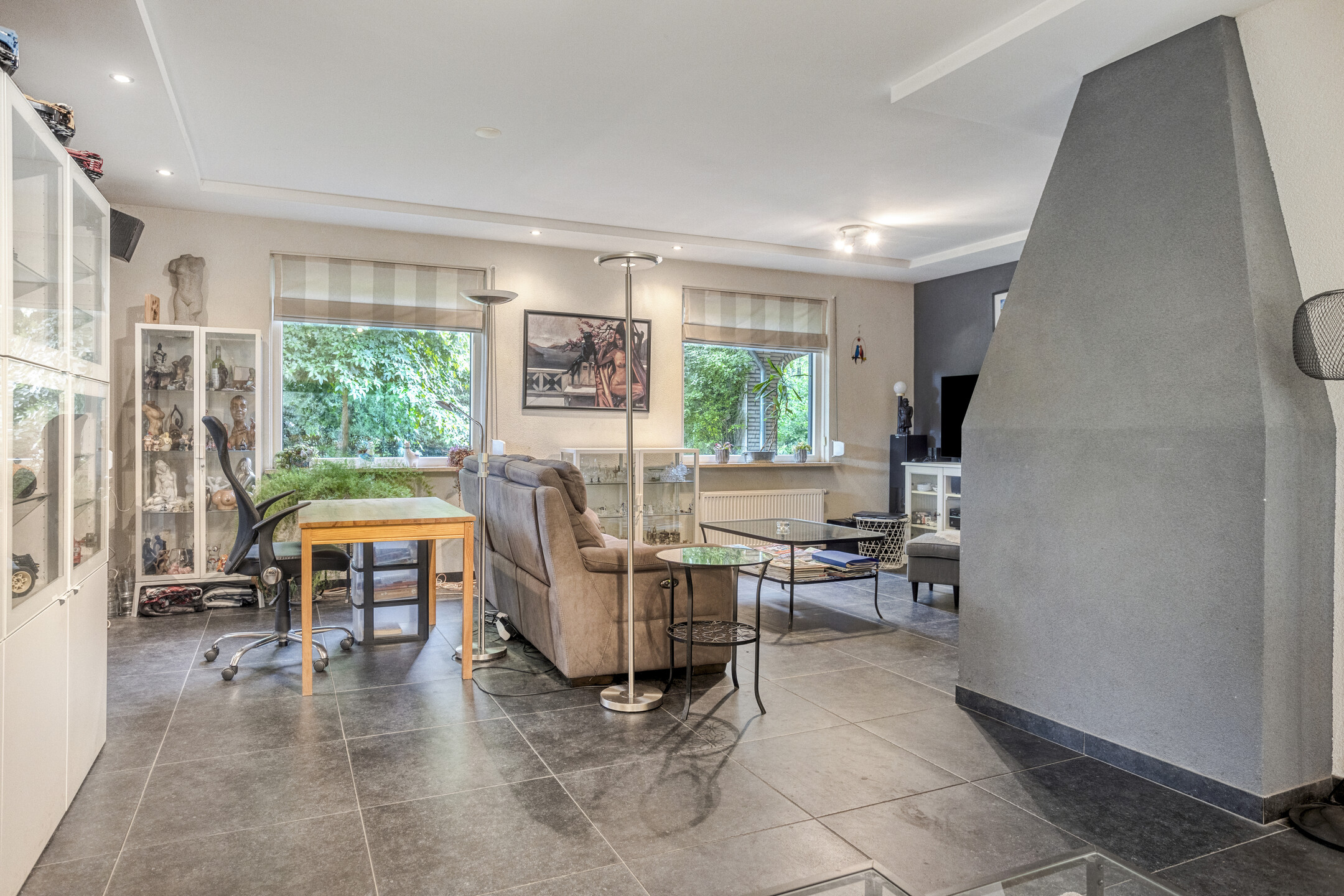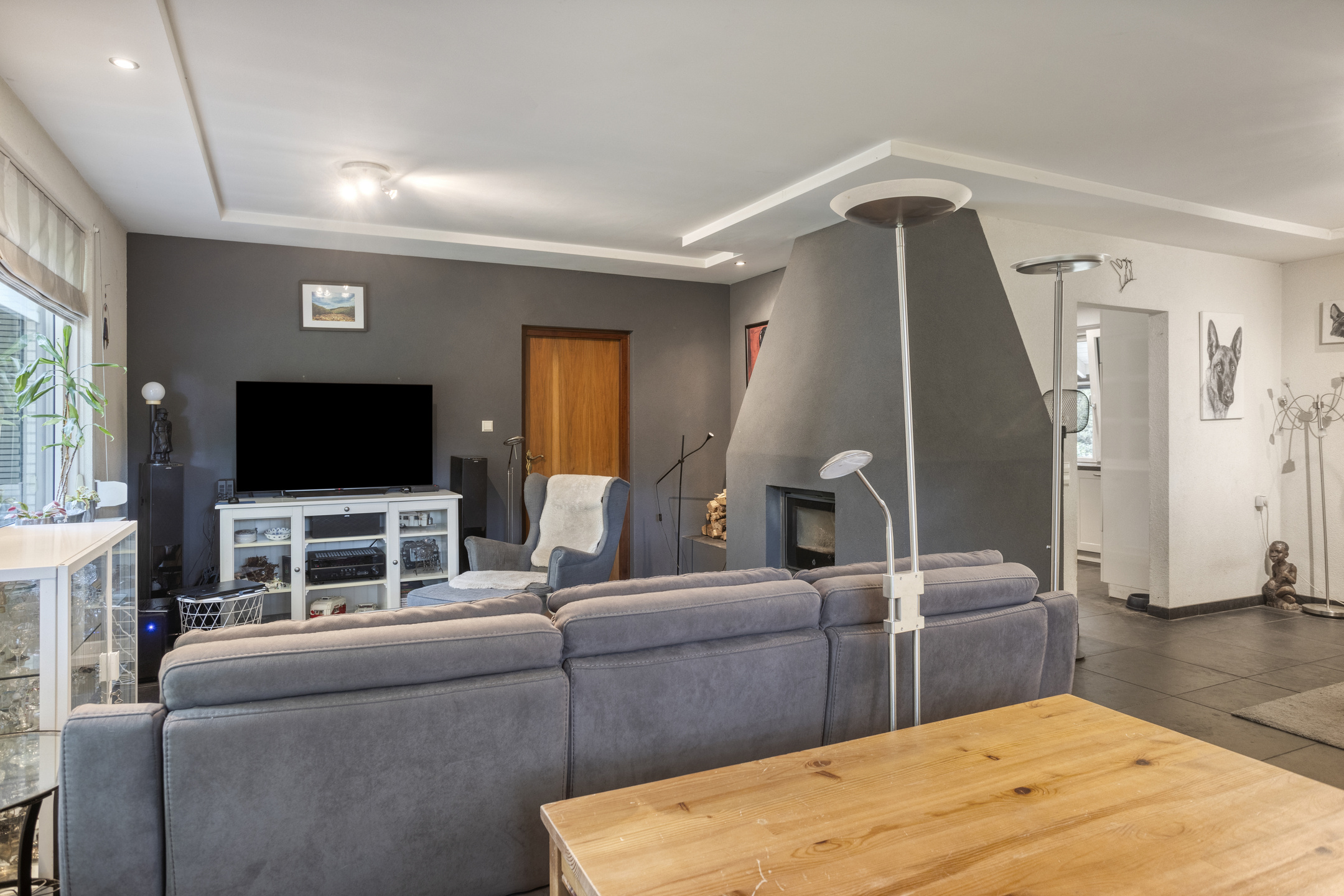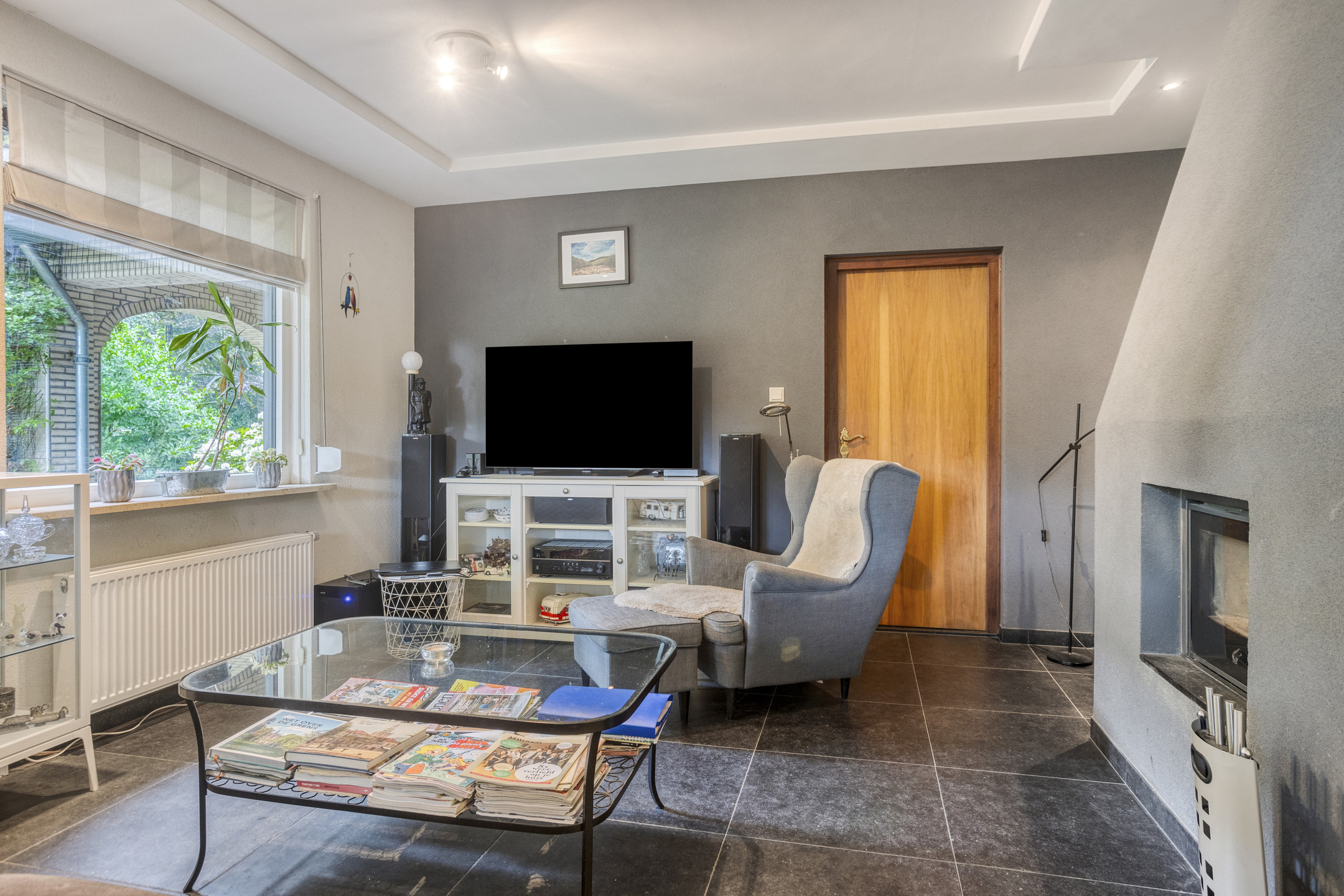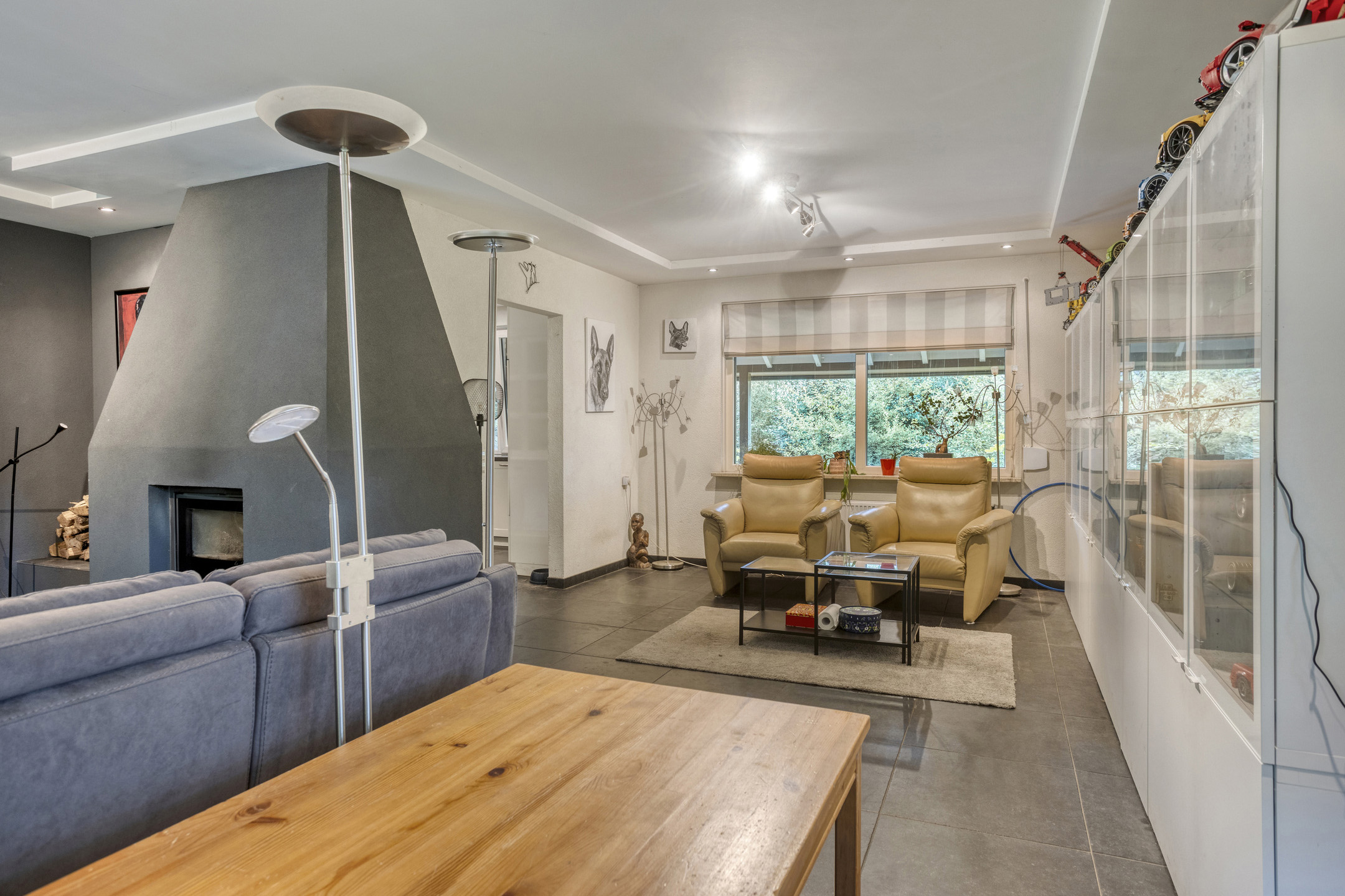 • L-vormige woonkamer (circa 42 m2) voorzien van betegelde vloer, open haard en inbouwspots.