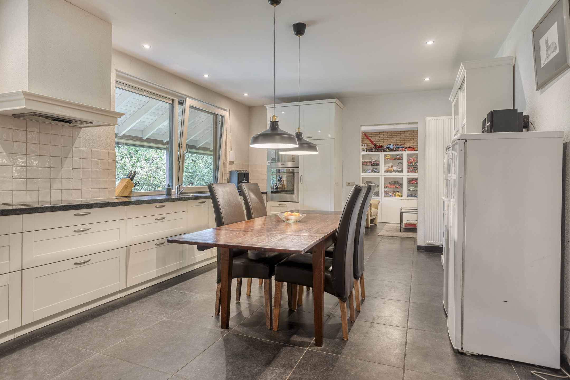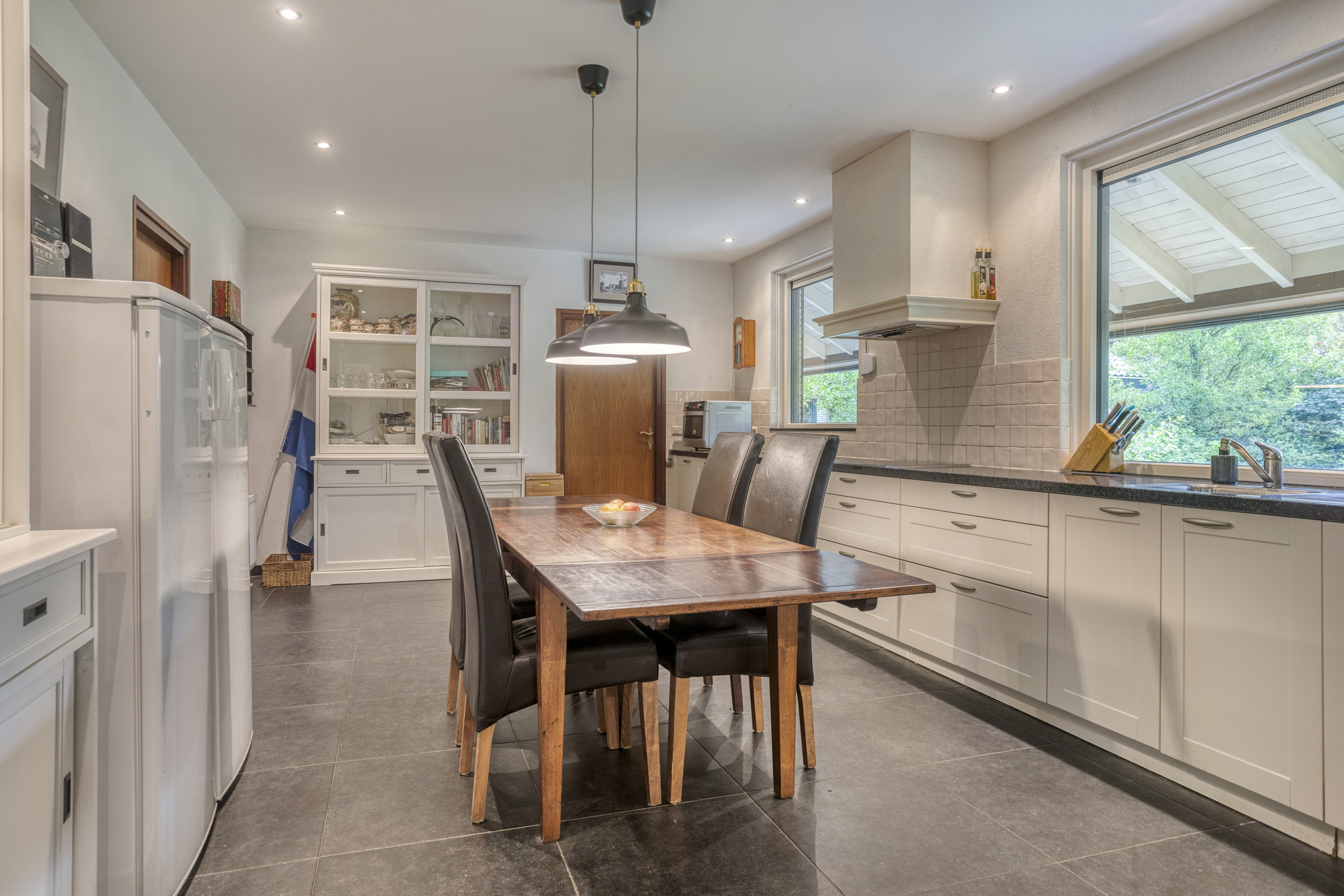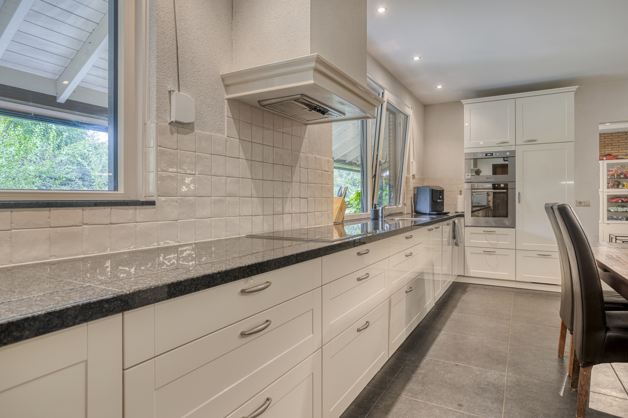 • Zeer royale woonkeuken (circa 16 m2) met betegelde vloer, inbouwkeuken voorzien van granieten aanrechtblad, koelkast, oven, magnetron, vaatwasser (2020), keramische kookplaat, afzuigkap en veel kastruimte.