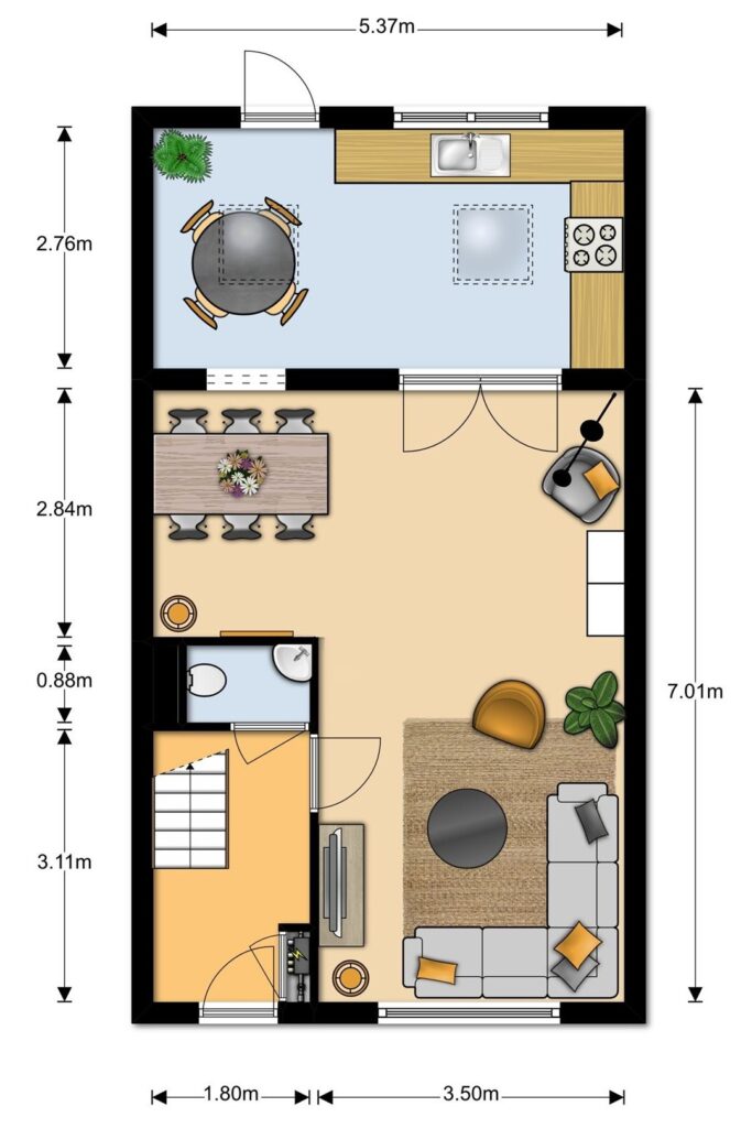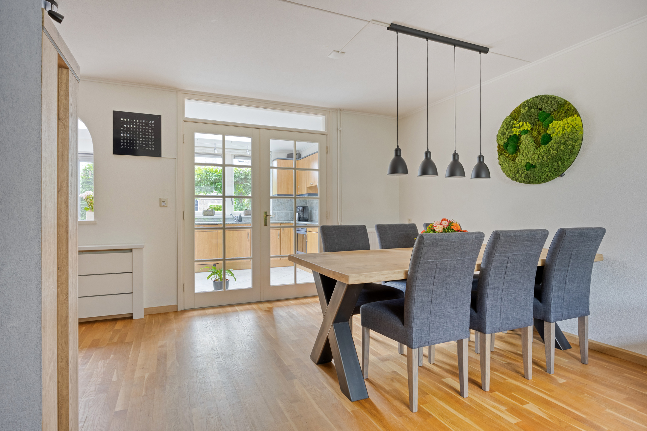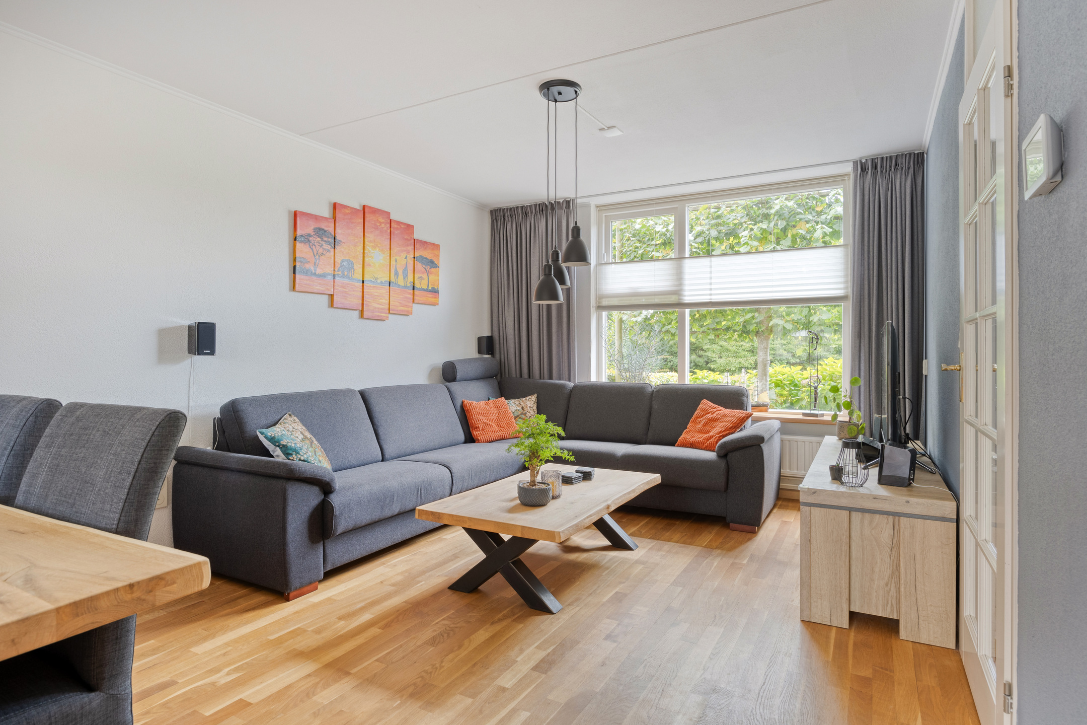 • Woonkamer (circa 30 m2) met dubbele glazen deur naar uitgebouwde woonkeuken.