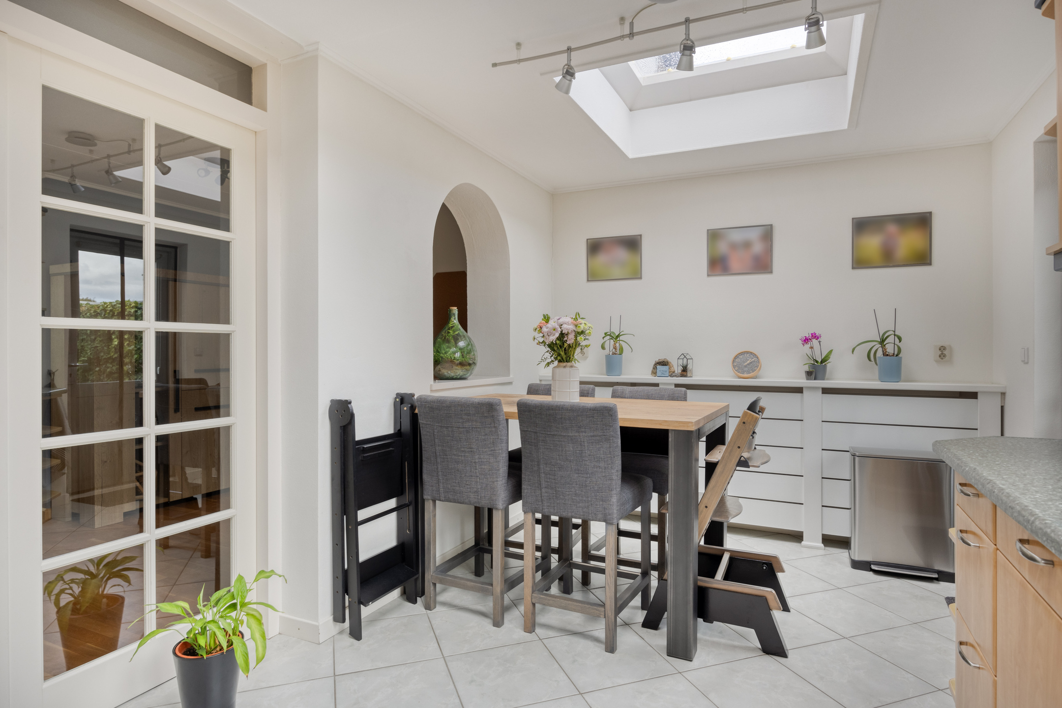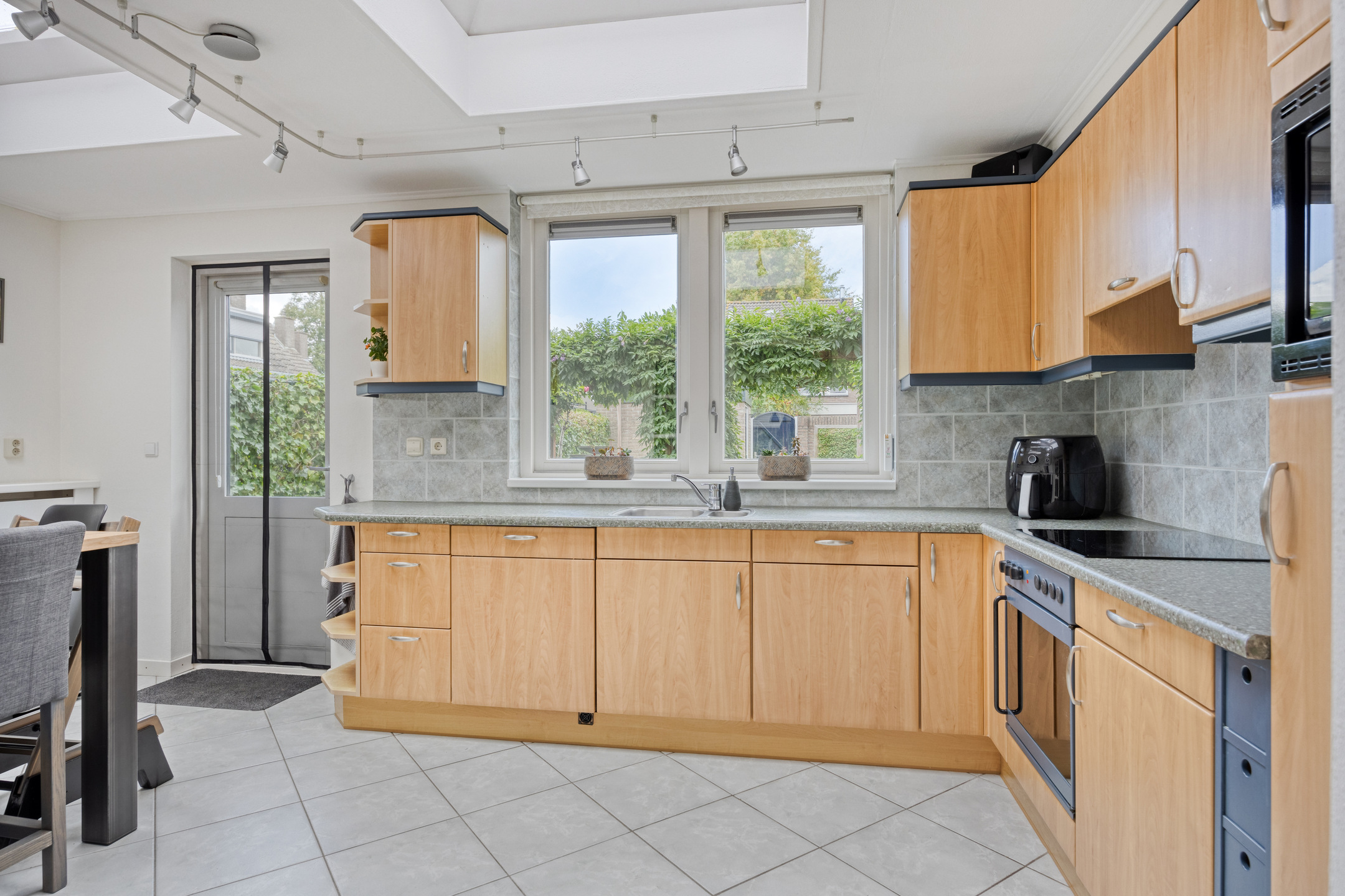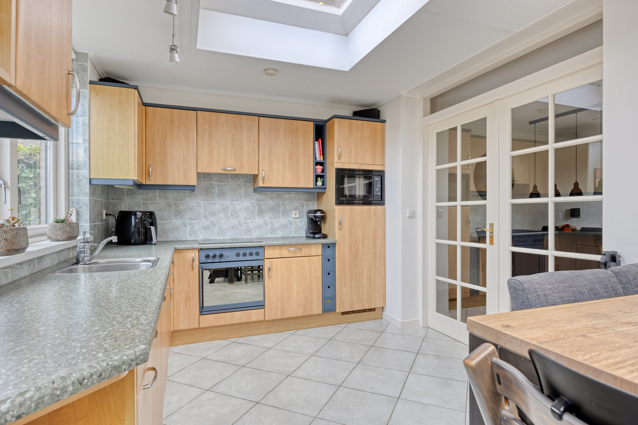 • Hele lichte, uitgebouwde woonkeuken (circa 15 m2) met betegelde vloer, twee lichtkoepels, deur naar tuin en inbouwkeuken voorzien van koelkast, magnetron, oven, inductiekookplaat, vaatwasser, afzuigkap en ruimte voor eethoek.