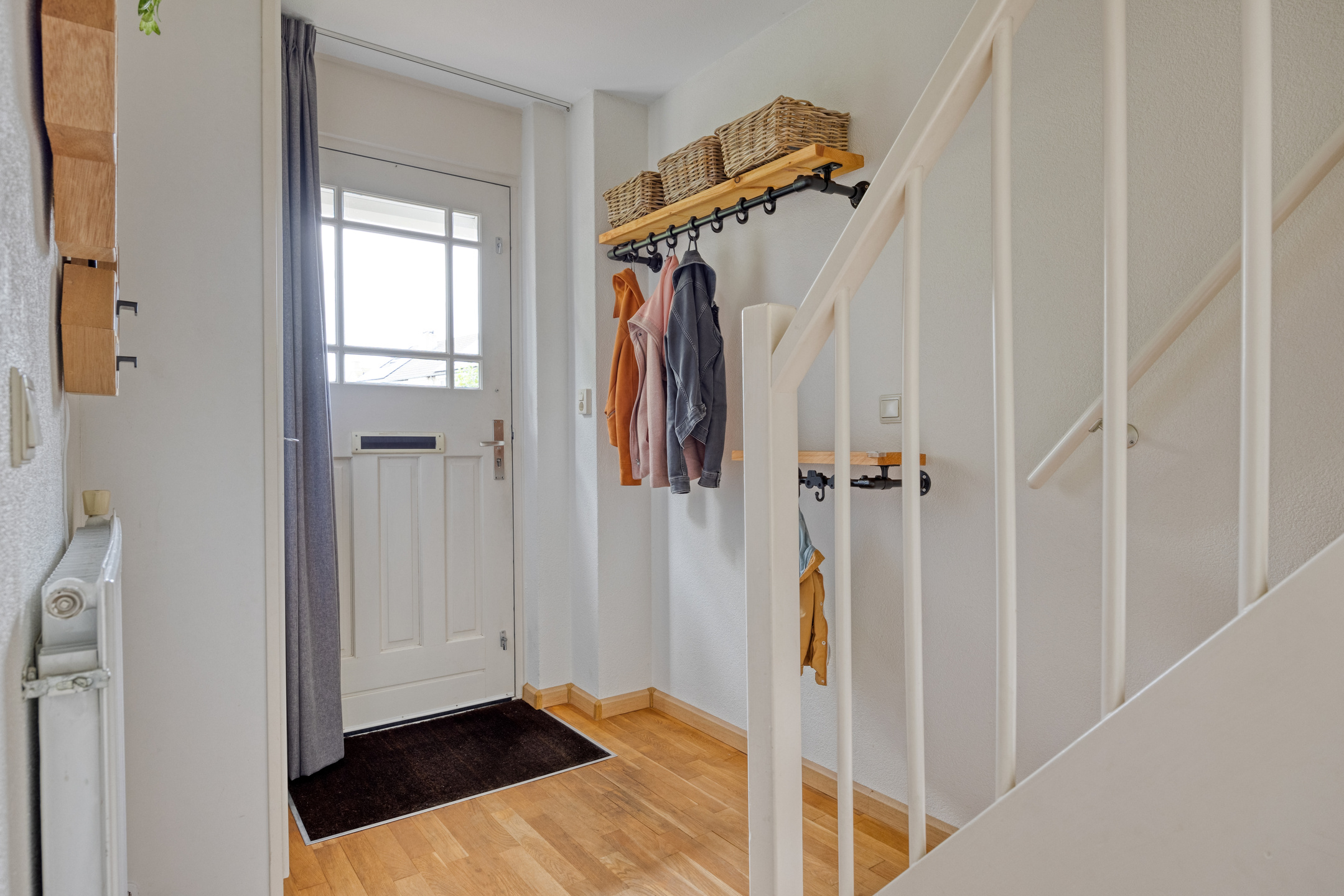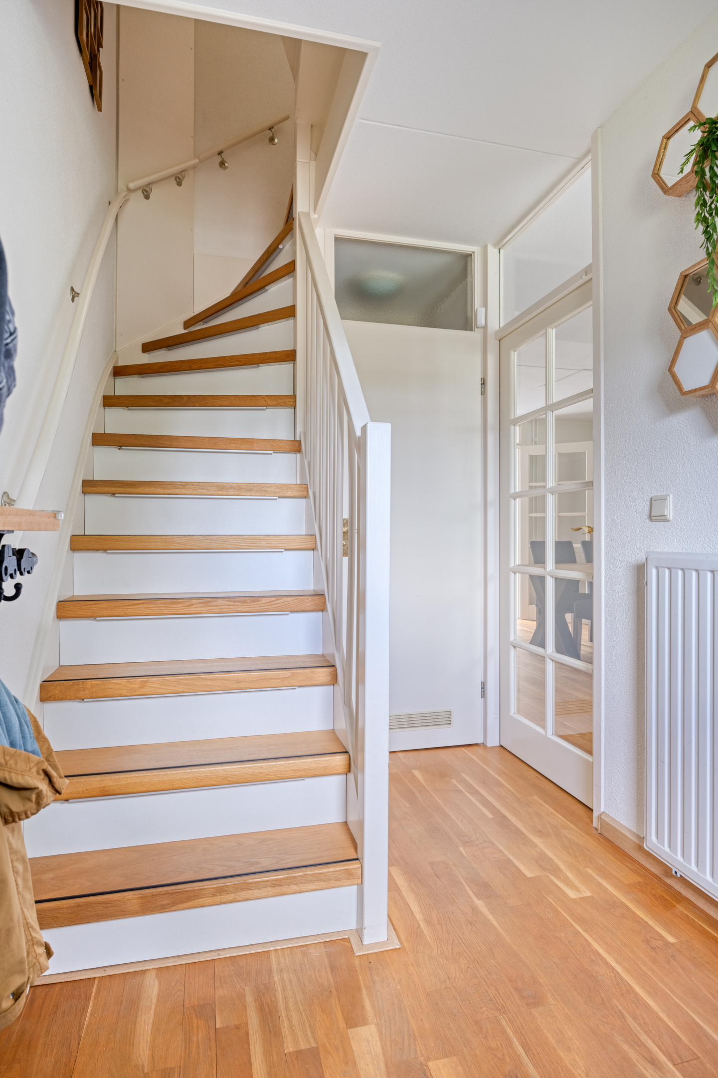 • Royale hal/entree met meterkast (zes groepen, kookgroep, extra groep voor zonnepanelen en wasmachine, en twee aardlekschakelaars) en trap voorzien van houten trapbekleding en automatische verlichting (eventueel ter overname).