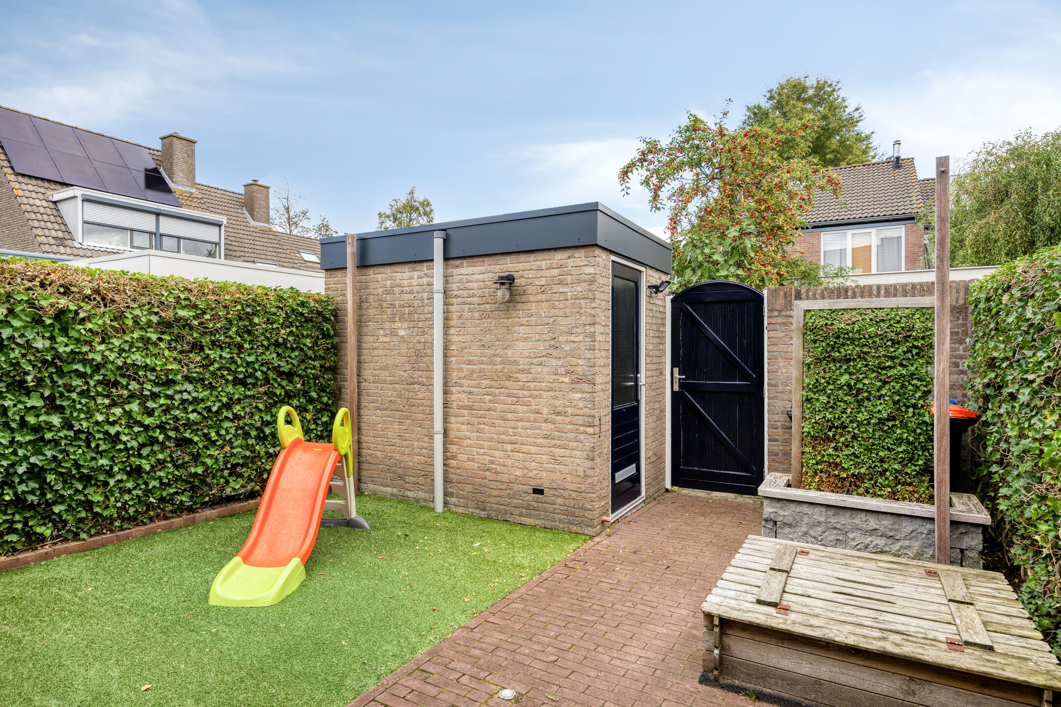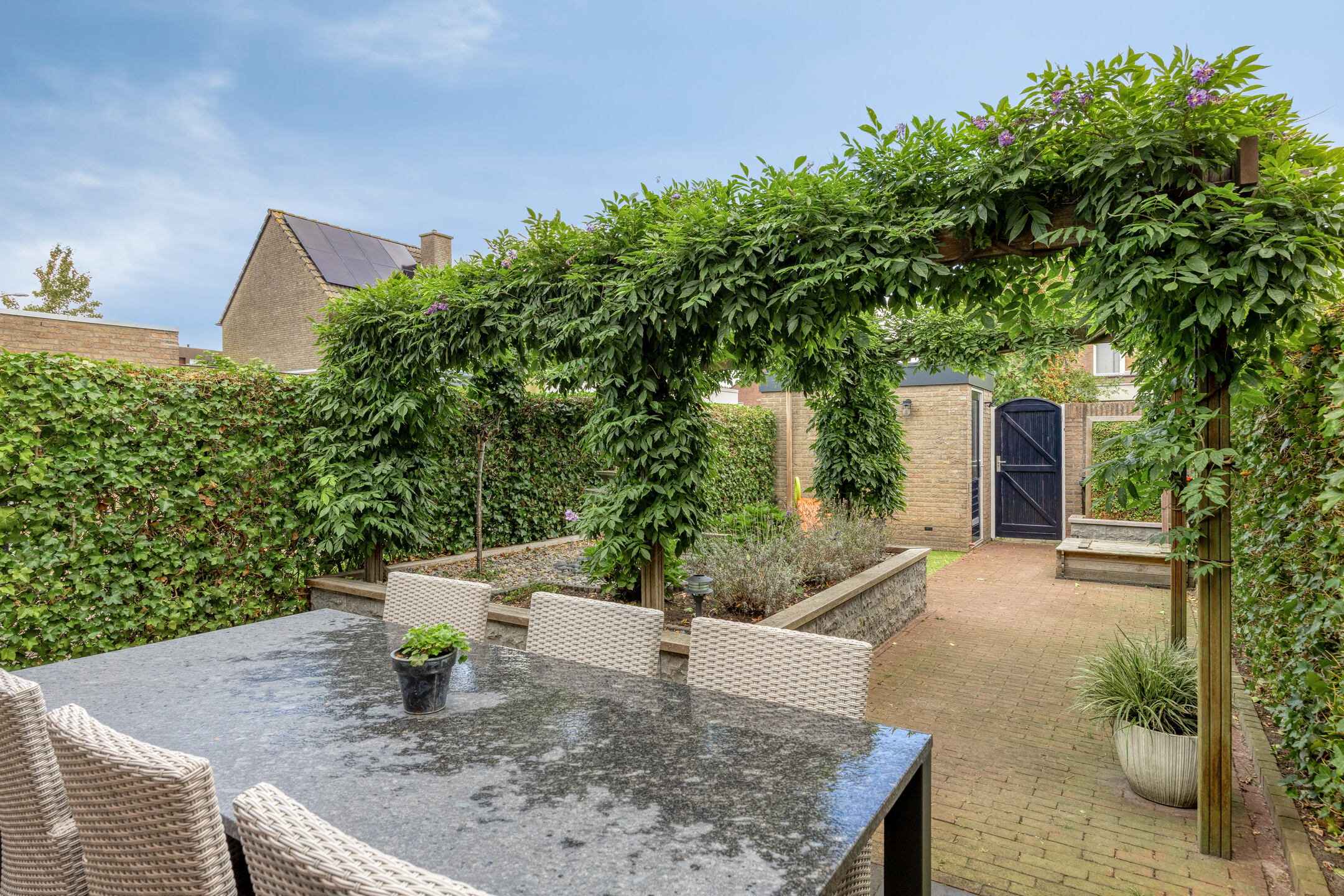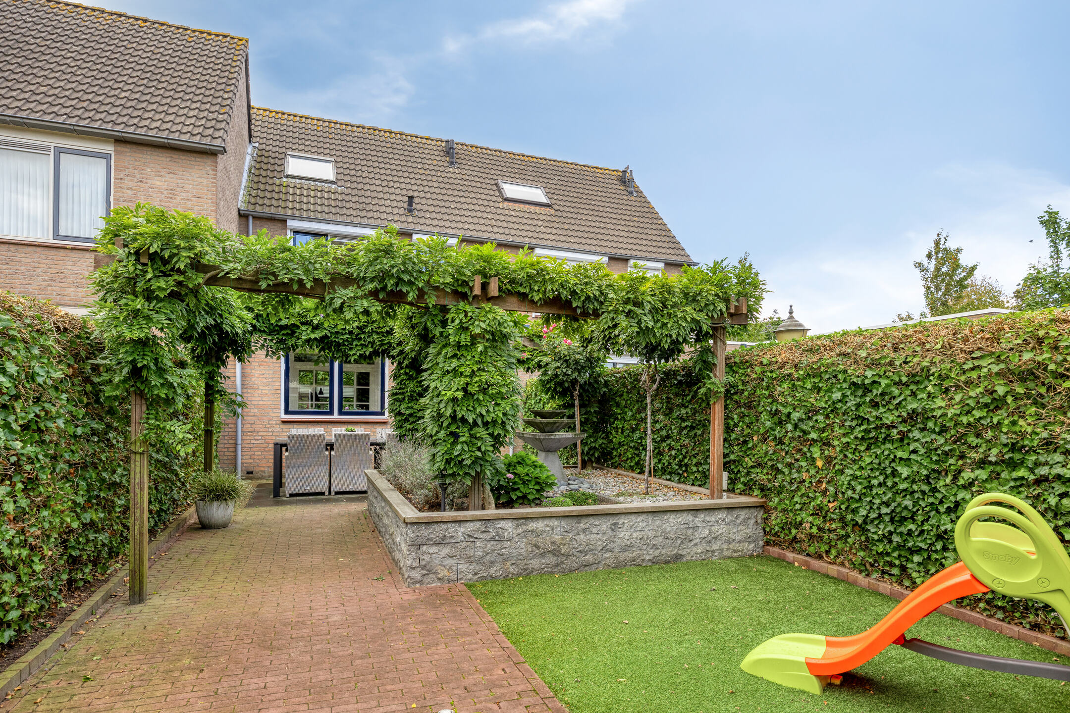 • Fraai aangelegde, zonnige achtertuin (circa 66 m2) met elektrisch zonnescherm, buitenkraantje en achterom.