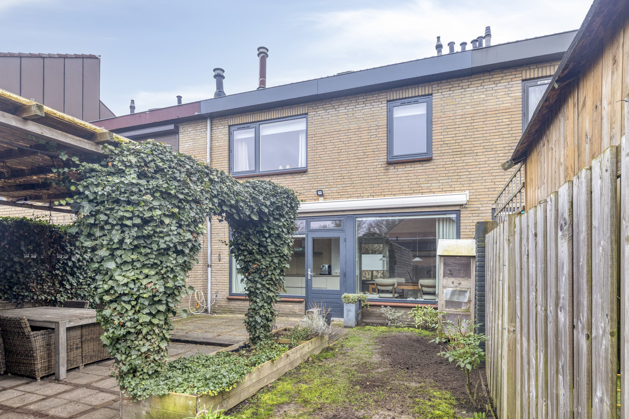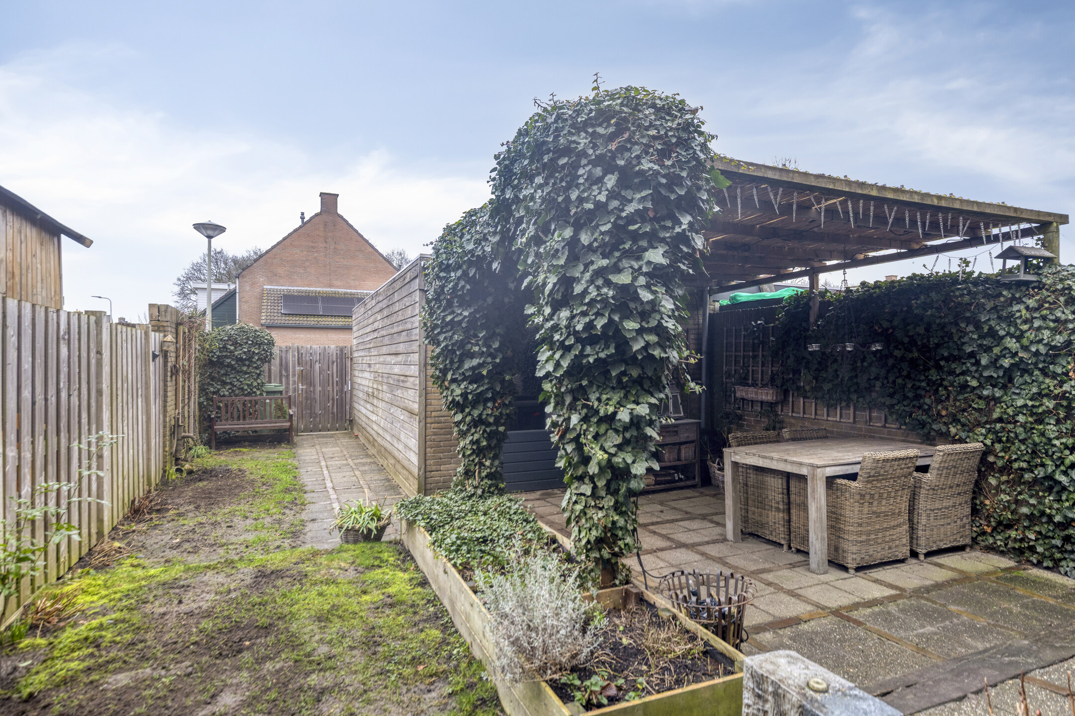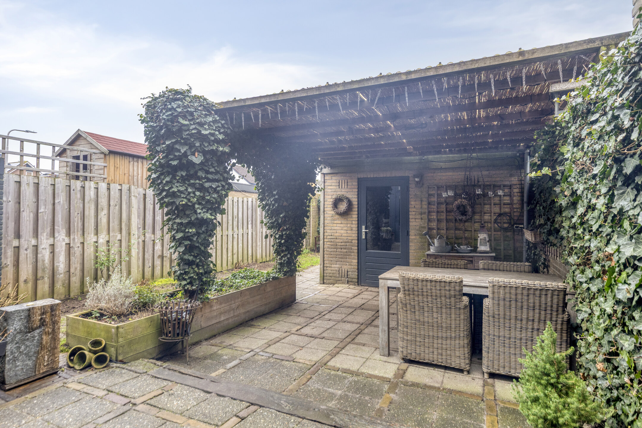 • Achtertuin met overdekt terras (circa 16 m2) en achterom.